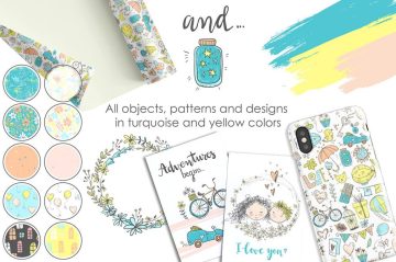 ......以及第二种颜色版本中的所有图案,物体和设计- 绿松石和黄色