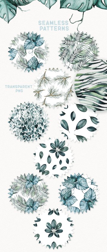 该套餐包括:15个透明的PNG文件PNG热带树枝,龟背竹,棕榈,松针,篮子植物,月桂树