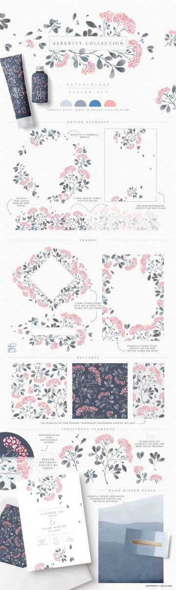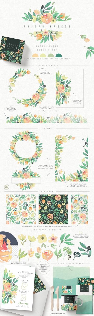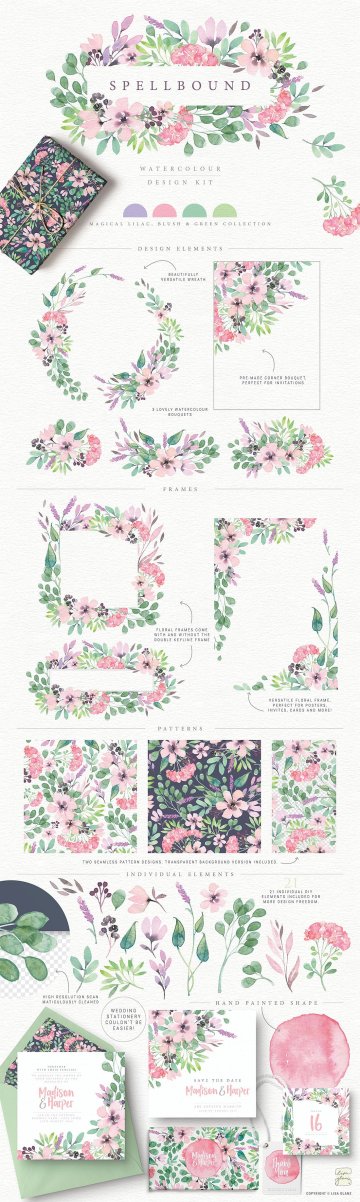 您将获得花卉框架,多功能边框,花圈,预先设计的背景以及每套更多,从而节省您的工作时间。或者为您的项目提供创意启动。