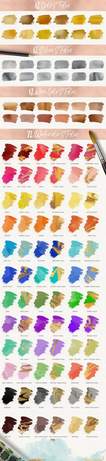 72水彩样式保存为Illustrator样本和Photoshop样式文件。
