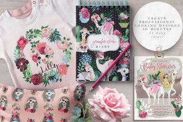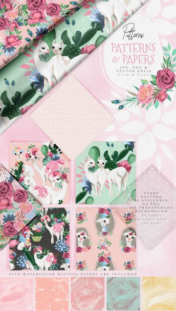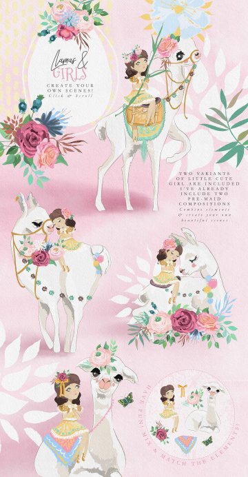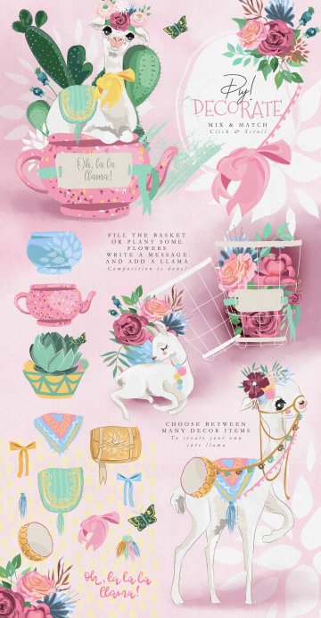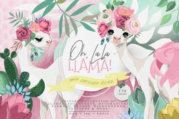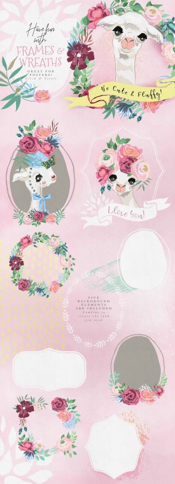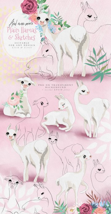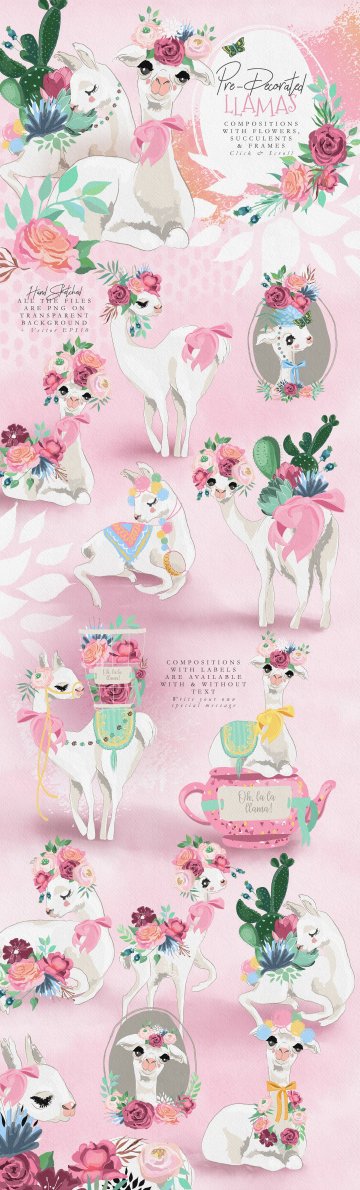 Oh La La Llama - 手绘草图矢量骆驼图形集合超过130种 - 美丽的骆驼,装饰品,花环和框架,数码纸和花木图案等等!