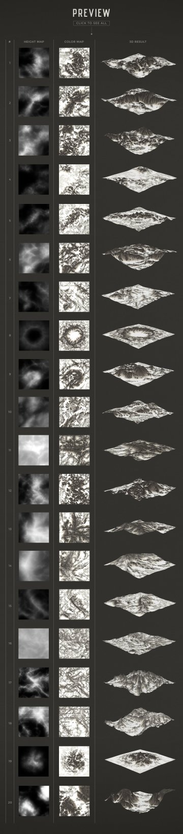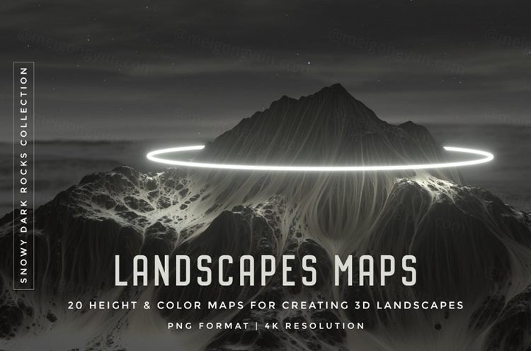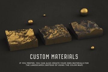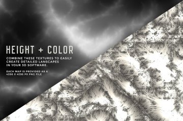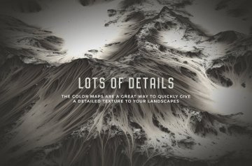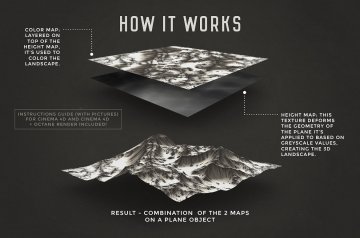 概念如下:对于每个景观,有两个地图(或纹理):一个颜色地图(用于纹理景观)和一个高度(位移)地图,它根据它应用的对象的几何形状变形。灰度值。较轻的值代表较高的山脉和丘陵,较暗的区域,较低的景观区域。通过使用平面和默认材质组合这两个地图,您将获得3D景观!该套装包括一个PDF文档,解释了如何使用Cinema 4D中的这些地图创建景观,但是,我不熟悉其他3D软件,因此您可能需要观看一些有关置换的教程以获取更多信息。