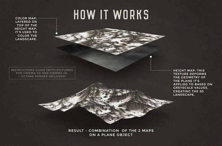 1 PDF说明指南解释如何使用Cinema 4D和Cinema 4D Octane Render中的这些地图创建景观。