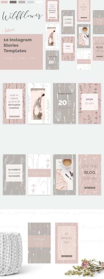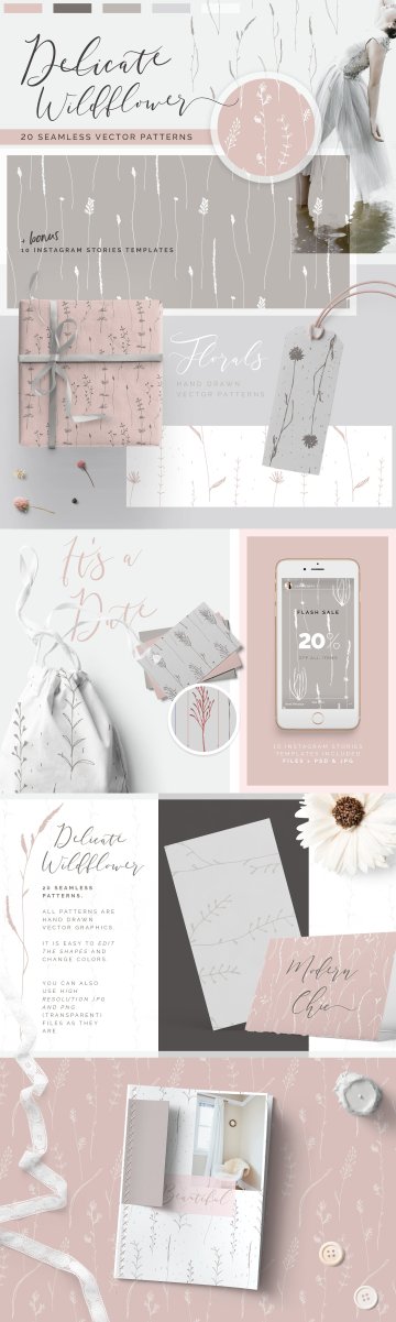 我很高兴向您介绍这套华丽的20个精致野花无缝矢量图案 加上10个Instagram故事模板的奖金。这是一个美丽浪漫的系列,充满了优雅的手绘花卉元素!