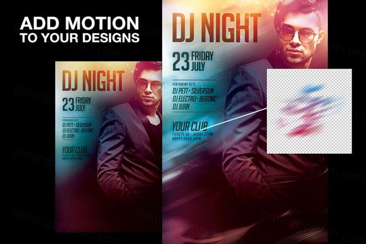 这个100 Motion Blrs系列创造了令人惊叹的大气艺术品。在实例中为您的传单和设计添加更多深度。只需将PNG图像拖放到设计中并尝试混合模式,直到它看起来正确。