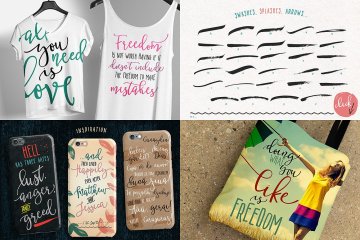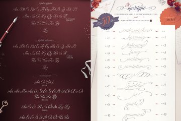 所有字体都有OTF和TTF版本。水彩元素以透明背景的光栅(PNG)格式存储。纸张和墨水样式仅适用于Photoshop。