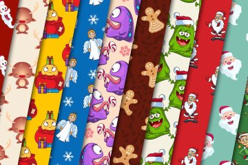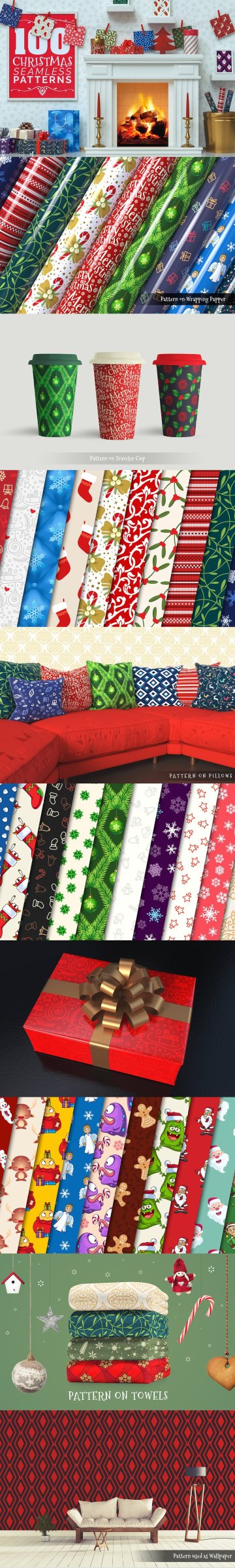 包含不同设计风格的冬季和圣诞图案:现代,复古,雪花,糖果手杖,花卉,针织,长袜,抽象,装饰,圣诞树,几何,蜡烛,条纹,绗缝,雪人,礼品盒,槲寄生,姜饼,驯鹿,卡通人物,雪人,圣诞老人,小精灵,格子,亚皆老街,北极熊,圣诞快乐文本,天使等。