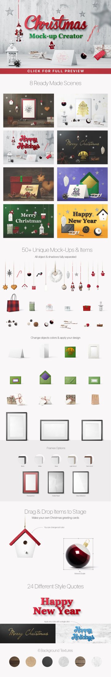优质,基于专业照片Christmas Mock-Up Creator。此文件可让您轻松创建独特,引人注目的圣诞假期卡,横幅或壁纸。只需将任何项目拖放到舞台上,移动并根据需要缩放它们,更改项目/背景颜色并应用灯光设置以满足场景的情绪,最重要的是我们创建了不同的样式引号,因此您不需要打扰字体样式,只需选择您需要的字体样式并放到场景中。最后,如果您没有时间或技能来制作自己的场景,只需使用8个现成场景中的一个。演示从未如此完美。