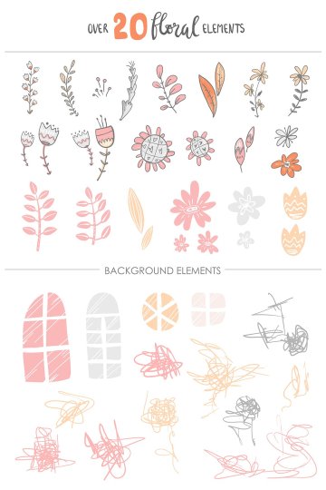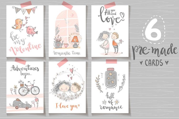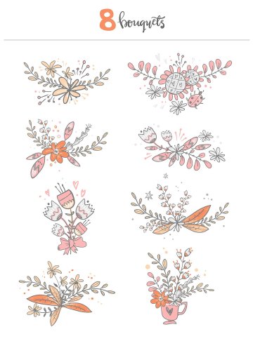 分享一组浪漫爱情主题卡通手绘素材下载[ai,eps,psd,png,jpg],超过50种不同的物体素材,超过20种花卉元素,8个花圈素材,8束花束,6张预制卡片,10款无缝模式。完全可编辑。
