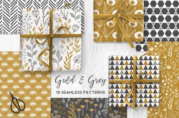 美丽的金色和灰色的集合定了调子的花卉和几何图案。完美的设计包装纸,纺织产品,墙艺术,文具等!