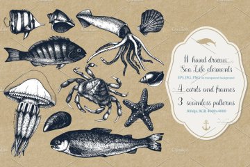 1 EPS 文件 + 1 JPG 文件 – 在白色背景上的矢量和光栅采集的海洋生物插图。