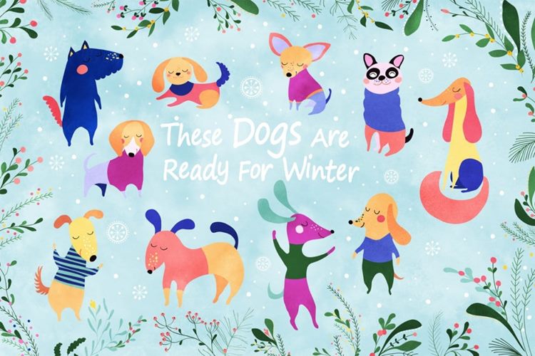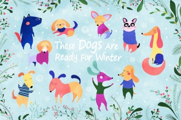 冬季假期集合的狗和浣熊,雪花和花卉元素,儿童海报,无缝模式和水彩纹理背景。Happy Dog Year