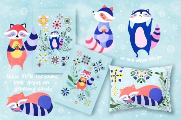 ?完全可编辑的矢量EPS文件:有组织,分层,易于使用。所有元素包括(狗,浣熊,花卉元素和花环)