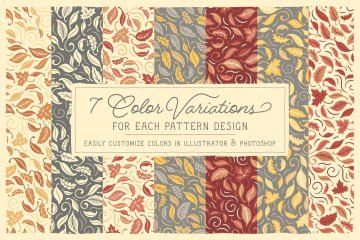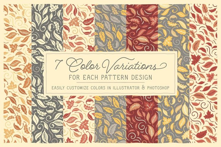 6种独特的叶子图案设计(如图2所示)。每种图案都有7种颜色可供选择(如显示3所示)。AI,PSD和PNG中可用的图案/颜色变化