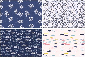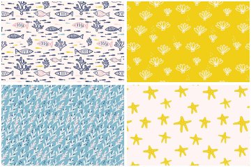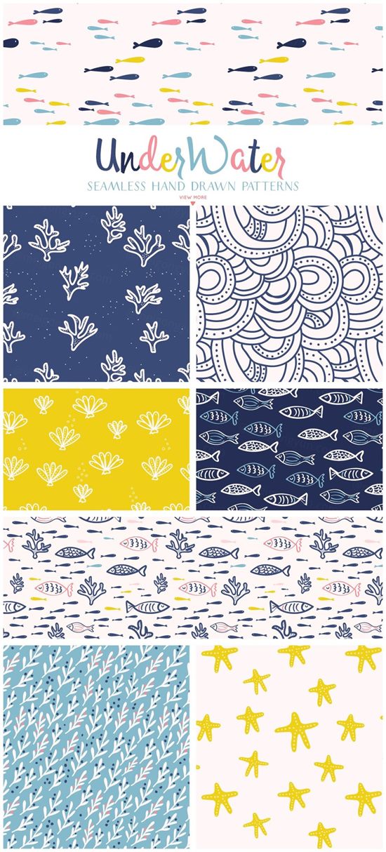 水下是一个手绘的图案集合,灵感来自大海和海洋生物。它有8种有趣和现代的图案,可以照亮任何设计。