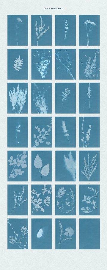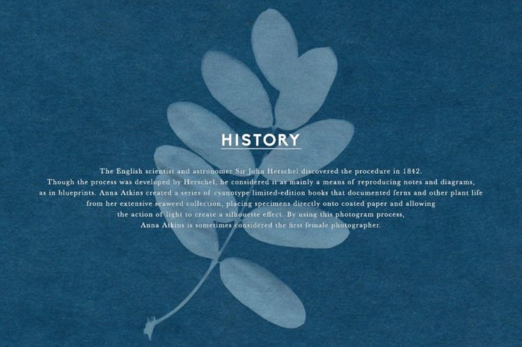 Cyanotype,也称为“blueprinting”,是最古老的非银照相印刷工艺。它涉及将已经用铁氰化钾和柠檬酸铁铵溶液处理过的材料暴露在紫外光源如太阳下。通过阻挡UV光到达敏化材料可以获得负像或正像。例如,通过将叶子放在用该溶液处理过的纸上并暴露在阳光下10至20分钟,可以产生负像。纸张在用水冲洗后将保留叶子的图像。一旦纸张干燥,暴露在阳光下的部分将变成普鲁士蓝(铁氰化铁)的阴影,而被叶子覆盖的部分将保持白色。