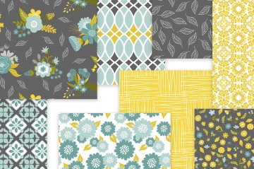 小野鸭蓝色,芥末黄色和灰色的美好的收藏定了调子花卉和几何背景。这些图案非常适合设计邀请函,墙壁艺术品,文具,面料产品等!