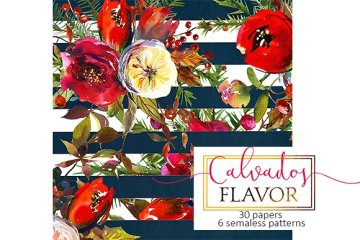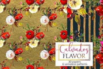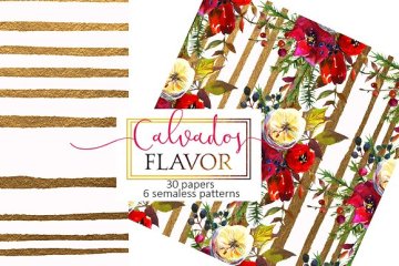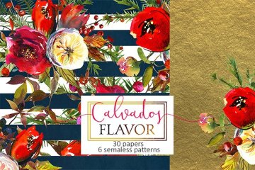 鲜艳的红色和白色的花朵,金色靛蓝白色背景和手绘条纹。大型,节日,热身设计论文和图案的集合。适用于包装纸,纺织品,织物,规划师,印刷品,邀请函,贺卡,网页和博客设计等等