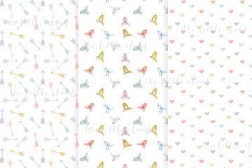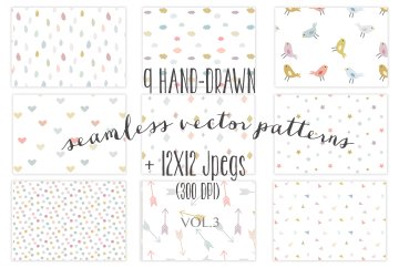 9种多彩手绘图案。 包括鸟类图案,波尔卡点,星星,箭头,心形图案,雨滴图案,云彩和三角形图案。