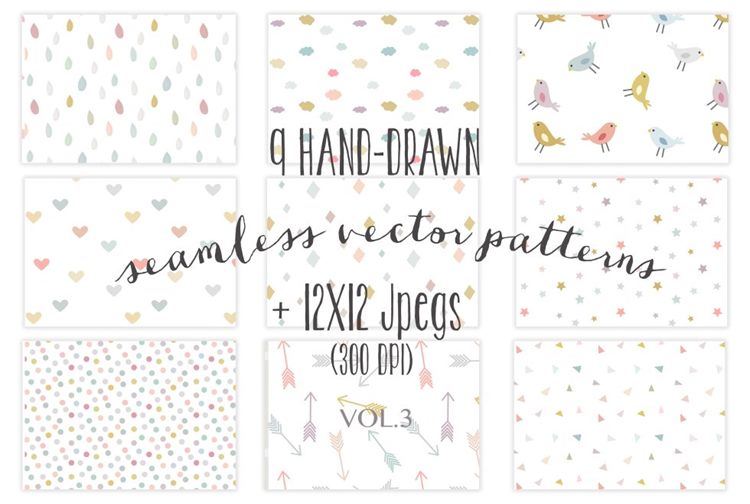 在Adobe Illustrator创造的9五颜六色的无缝的手拉的背景。包括鸟图案,波尔卡圆点,星星,箭头,心形图案,雨滴图案,三角形和云图案。