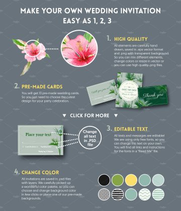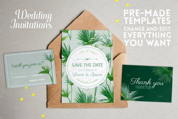 10张婚礼卡片和邀请函(带有图层和可编辑文字的.PSD文件!)。您将获得一个“自述”文件,您可以在其中找到可在设计中下载和使用的免费字体的说明和链接。