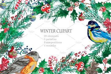 导航冬天clipart包括28个元素,2个构成,5个无缝的样式和4个花圈,完善对新年和圣诞节邀请,贺卡,scrapbooking,缎带包装,纺织品,印刷品设计,制造业,网站背景。