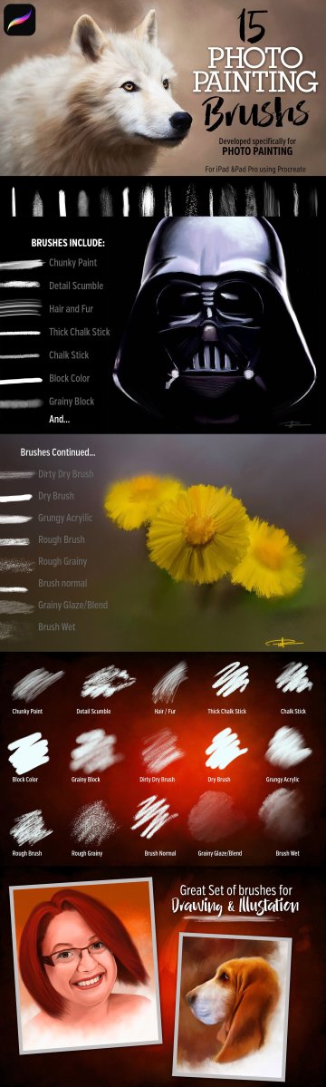这个画笔集是围绕照片绘画开发的。涂抹设置已设置为生成15种风格独特的画笔,可用于创建照片画。当用作绘画时,它们是数字插图的绝佳工具,提供传统的外观和感觉。这些刷子专为高分辨率工作而设计。