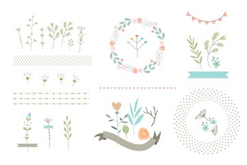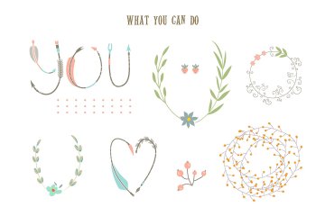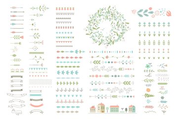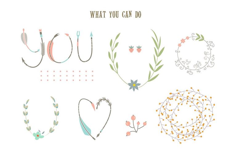 丝带,箭头,圆点,心,鲜花,浆果,树叶,卷发,早午餐....所有你需要的创建徽标,横幅,标题,婚礼请柬,生日贺卡,剪贴簿,派对装饰,邀请卡,标签贴纸,礼品包装,包装,婴儿服装,节日礼品,面料印花等等......