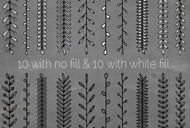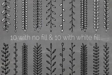 10个无填充的手绘花刷和10个白色填充。 这些都很适合制作复古的商标、手绘的徽标、别致的边框和自然的广告。它们都有转角,而且完全无缝。 避免砍伐森林,用这些手工制作的花卉画笔创造美丽的设计。