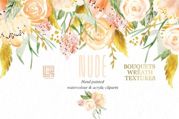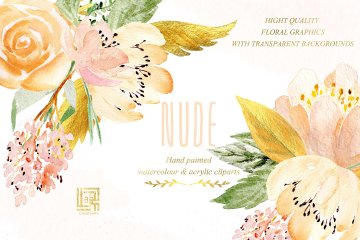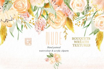 裸色与黄金水彩花卉设计素材 Nude gold. Wat