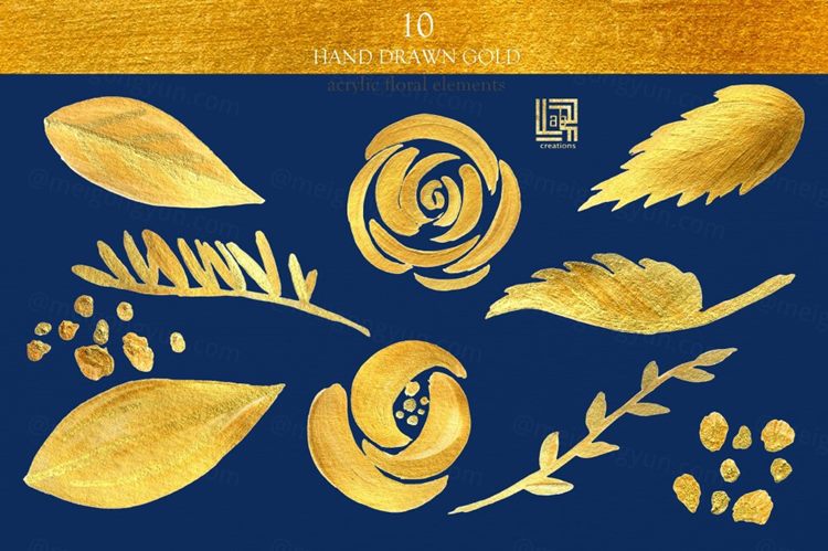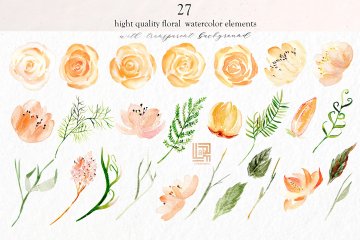 此系列包括:?27个独立的水彩花卉/叶子图像,PNG格式,透明背景?10个独立的亚克力金色花朵和树枝?6个PNG格式的花卉布置,透明背景?1个PNG格式的头部排列,透明背景?1个水彩花圈PNG格式的图像与透明背景?2手绘水彩纹理以jpeg格式。?2张PNG和JPG格式的手绘丙烯酸纹理。