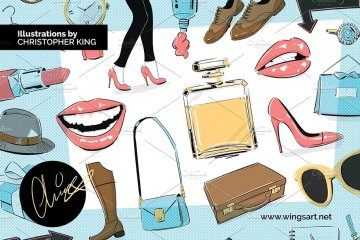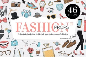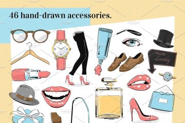 这组合集包括了46个单独的插图,包括了口红,高跟鞋,香水,旅行行李,智能手机,化妆品,钻石,老式相机等手绘插图。这些时装道具和图标为博主和图形设计师提供完美的资源,将成为您的专业质量图形的新收藏。