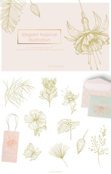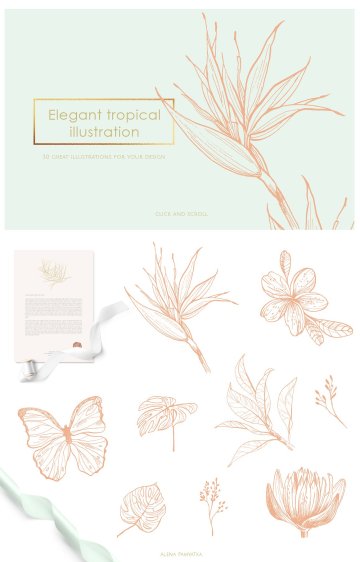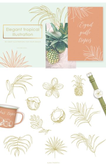 。热带花卉,蝴蝶,椰子,棕榈叶等等的插图将帮助您创造多汁的设计。