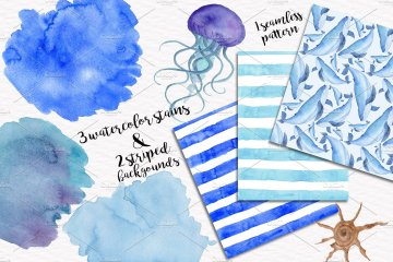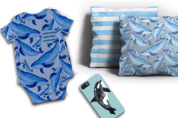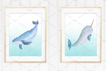 鲸鱼和海洋动物水彩插画 Watercolor Whales