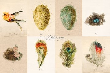 鸟,蛋,羽毛和巢的复古插图用水彩元素进行数字化绘制,以创建美丽的图形,突出您的设计。每个水彩图形都是相当大的比例(最高或最宽点约为3000多个像素),并且采用透明背景的png格式。包括25只鸟,2个巢,2个鸡蛋和4个羽毛。
