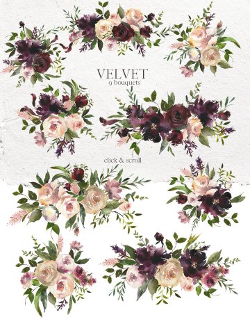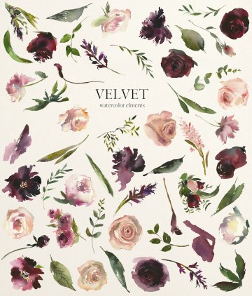 优雅精致手绘水彩花卉剪贴画 Velvet-Watercolo