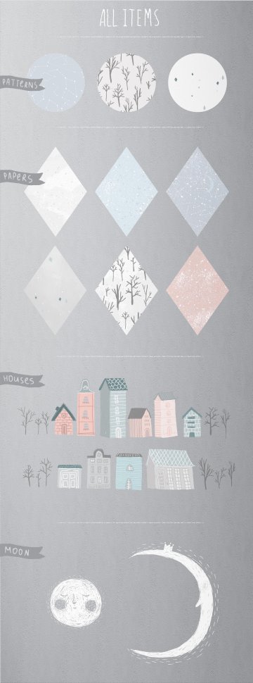 五张卡片,六张数字纸张,三张无缝图案和工作人员物品:卫星和房屋。所有项目都是在Photoshop中创建的,但它们都是高分辨率的。此外,我创建的所有对象和图案都是PNG,具有透明背景,因此您可以轻松创建自己的卡片和设计。