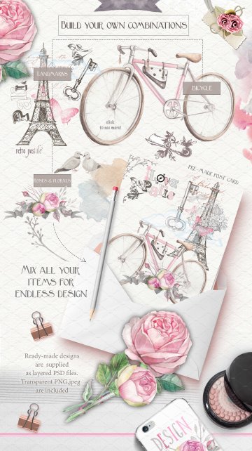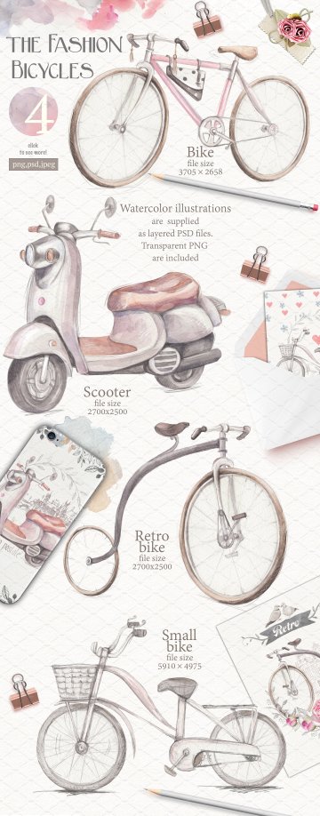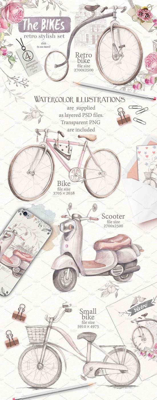 优雅文艺风自行车与玫瑰手绘插画元素 Bicycles-and