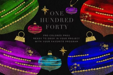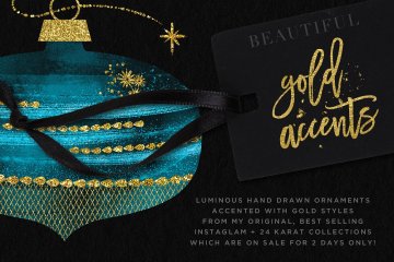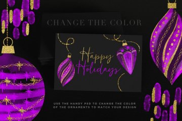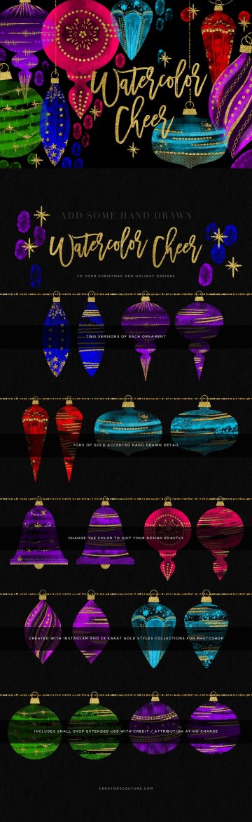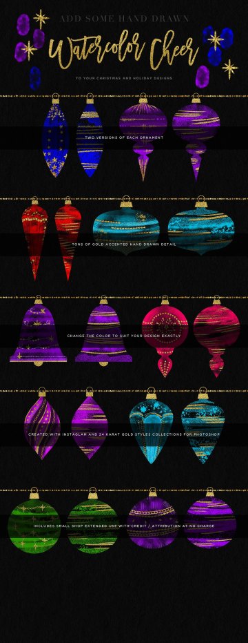 介绍我的新水彩欢呼圣诞饰品插图套装,这是一个特别创造的夜光手绘水彩饰品系列,饰有美丽的金色!您不仅可以获得主PSD,还可以轻松地重新着色插图以及将它们拖放到您的设计中,但它还包括140个预先准备好的PNGS!