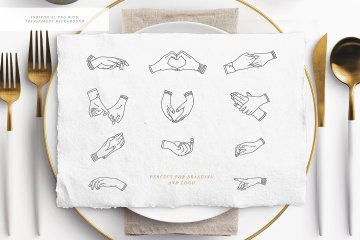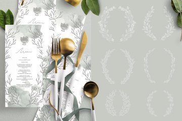 只需添加现成的图形:图案和框架。但也有各种各样的元素:手,花香和婚礼地图元素。为方便使用,所有物品均以灰色和白色存储。只需连接程序中的必要元素即可。