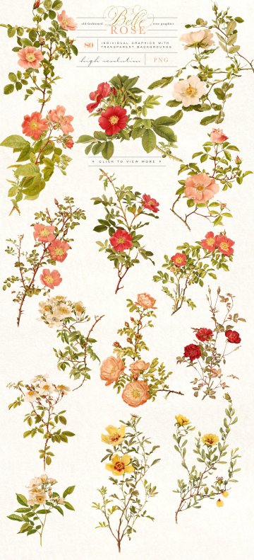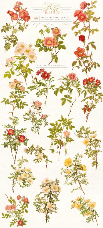 古色古香的植物玫瑰采用数字绘画技术处理,具有可爱的效果和帆布质地。这些精美的图形非常适合各种设计项目,并且具有大规模(最高或最宽点为2500-4000像素)以及具有透明背景的PNG格式的高分辨率。