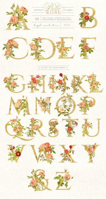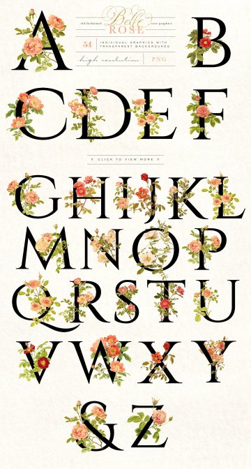 在百丽玫瑰仿古图形软件包包括80壮观典雅的桃红色,红色,桃和白色的老式玫瑰和两套花印章AZ,以及在黑色和金色闪闪发光&符号。