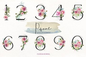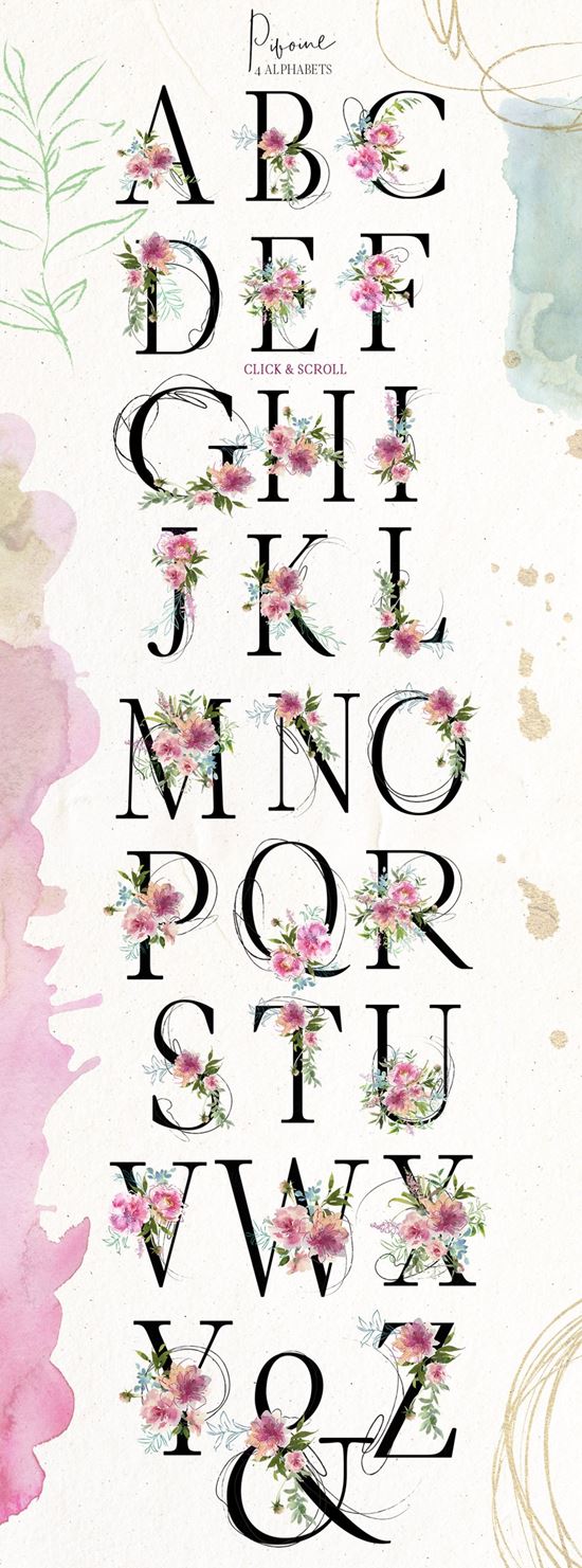 手绘水彩花卉字母数字设计素材 Pivoine-Waterco