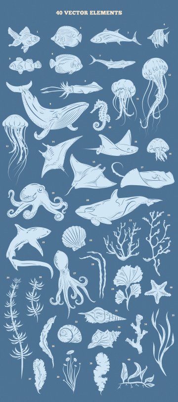 40个矢量海洋生物 - 1个AI文件,1个EPS文件,40个PNG