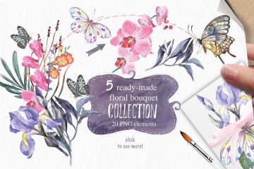 这组合集包含了蝴蝶花、木兰枝、水仙花等PNG格式的花卉元素、现成的PSD分层花束、蝴蝶等图形元素。:)