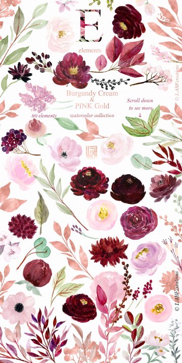 图穷联素材库 » 勃艮第手绘水彩花卉植物设计素材 Burgundy-cream