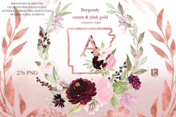 勃艮第奶油和金粉色水彩花。水彩花卉数字剪贴画设计师套件