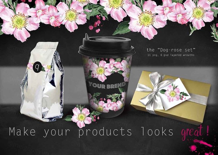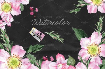 --11 PNG文件:花卉框架,狗玫瑰花,叶子,黑色背景纸,水彩墨水,