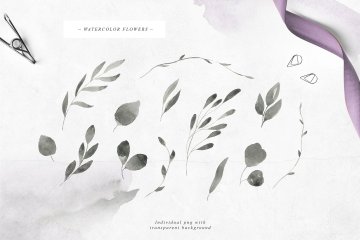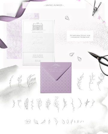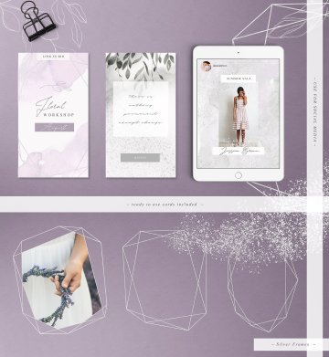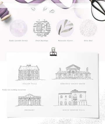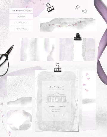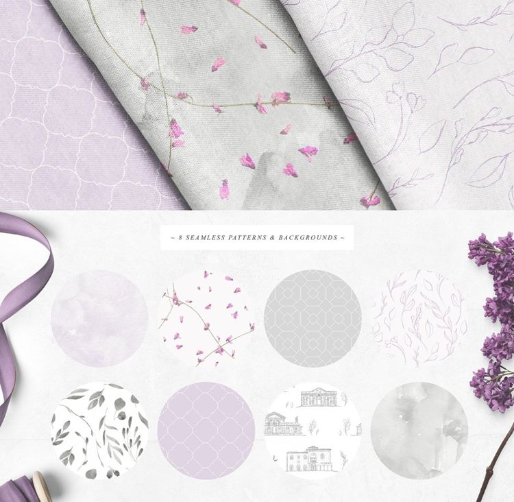 薰衣草色调顺畅地变成浅灰色水彩形式。只需添加现成的图形:模式和社交媒体卡。但也有各种各样的元素:花卉,颜色形状,建筑物和纹理。请务必单击图像以查看所有元素。