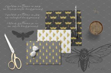 3个PNG文件 - 3个光栅图案,在透明背景上有金色昆虫;